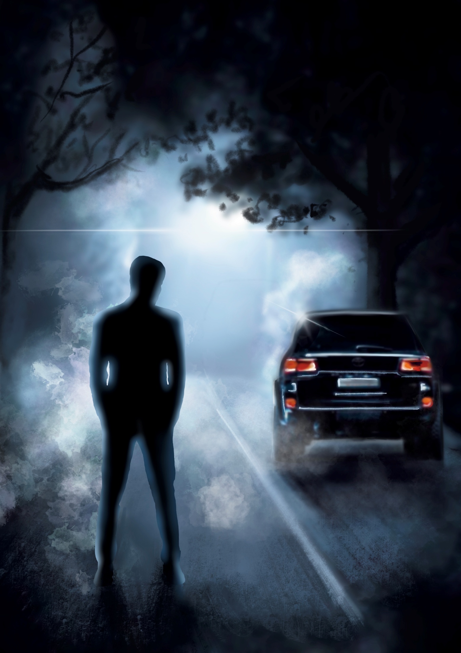 Не говоря ни слова, он завел машину, и стал медленно выезжать в сторону трассы. Я обернулась, чтобы посмотреть в окно, и в свете задних фар, увидела своего темного ангела. Он стоял к нам спиной, широко расставив ноги и опустив голову. Руки были в карманах, а сам он был весь как каменная статуя посреди дороги.