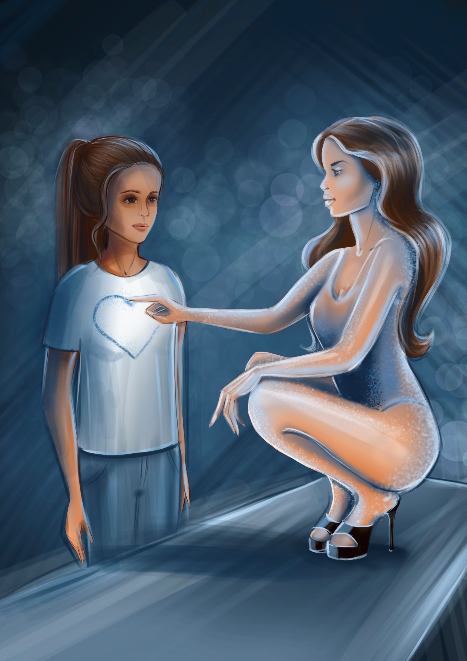 Девушка, на которую я засмотрелась, заметила это, и стала медленно ко мне подходить, а я только и думала о том, как она умудряется танцевать на таких высоких каблуках и платформе, в которой бултыхалась такая же мерцающая жидкость. Глядя мне прямо в глаза, она стала водить пальцами по своему телу, прикасаясь даже к самым интимным частям, как будто соблазняя меня. Я даже обернулась, в поисках предмета ее соблазнения, но это была точно я. Смотрела она, только на меня. Потом она присела, и мы стали с ней на одном уровне, так как стояла она на платформе. Девушка поманила меня пальцем, и я с любопытством подошла к ней поближе. Она вытянула руку и указательным пальцем нарисовала сердечко на моей белой футболке в районе груди. След от ее пальца засветился голубой краской, такой же, в которой была она сама. Потом она послала мне воздушный поцелуй, встала и продолжила заниматься своим делом, более не обращая на меня никакого внимания.