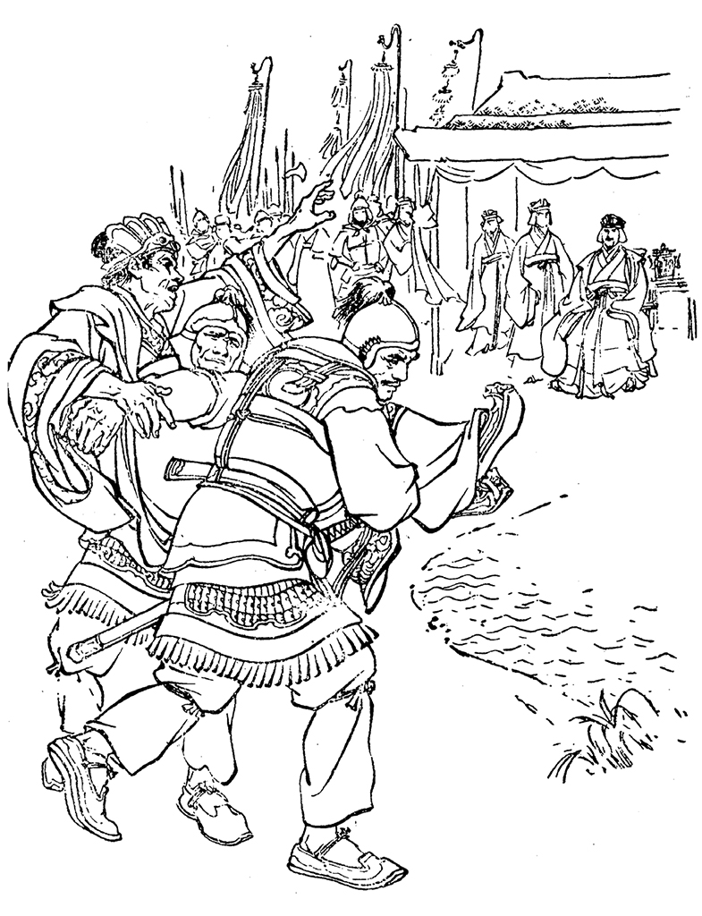 Через некоторое время Симэнь Бао сказал: «Ведьма старая и бесполезная, так долго и не возвращается. Вы, молодые ученицы, идите поторопите ее! Вслед за этим, дважды прозвучало «плюх, плюх», и две ведущие ученицы были брошены воинами в реку. Все засмеялись и начали болтать. Они смотрели то на центр реки, то на лицо Симэнь Бао. Через еще некоторое время Симэнь Бао сказал: «Женщины ничего не умеют делать, так что добрые люди, которые делают что-то полезное, идите!» Старосты, которые часто вымогали деньги у простых людей, пытались сбежать, но им преградила путь группа простых людей, и одного за другим поймали воины. Они все еще хотели бороться, Симэнь Бао громко крикнул: «Идите быстро, обратитесь к речному богу Хэбо, с ответом скорее возвращайтесь!» Воины толкали влево и вправо, старосты ничего не могли сказать, и были брошены в реку. Они кричали, но спастись им не удалось. Среди толпившихся людей кто-то смеялся, кто-то указывал пальцами на центр реки, ругая плохих парней. Симэнь Бао поклонился большой реке, и некоторое время почтительно ждал. Некоторые люди боялись, некоторым это нравилось, а некоторые стиснули зубы. Но никто не хотел уходить, все хотели знать правду.