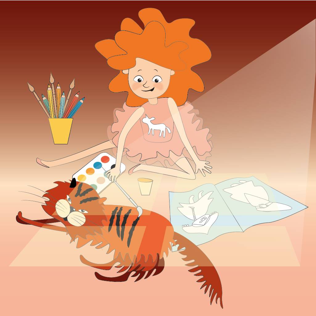 Однажды Анюта сидела на ковре у себя в комнате и раскрашивала картинки. Ей как раз недавно подарили новогоднюю раскраску. В ней было столько всего интересного: Дед Мороз и Снегурочка, пушистые елки и снеговик, мешки с подарками и дети на санках. Красилий отдыхал рядом, подставляя бока зимнему солнцу, и мурчал от удовольствия. Вдруг Анюте захотелось провести чёрной краской по его пушистому рыжему боку, всего один разочек. А потом ещё один. Получилось так красиво, и будто уже и не кот вовсе, а немного тигр! Красилий к тому моменту уснул и нежное поглаживание кисточкой ему совсем не мешало. Анютка не смогла остановиться, пока не изрисовала полосками весь правый бок Красилия. Кажется, получилось хорошо! – удовлетворённо оглядела она кота. Затем собрала кисти и краски и пошла выливать разноцветную воду из стаканчика. А в этот момент в комнату заглянула ее сестра и увидела на ковре… тигра!!!