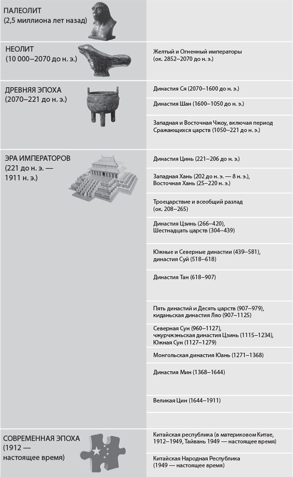 Пропуски и частичное наложение дат означают времена хаоса, восстаний и раздробленности. Даты до эпохи Хань даны приблизительно
