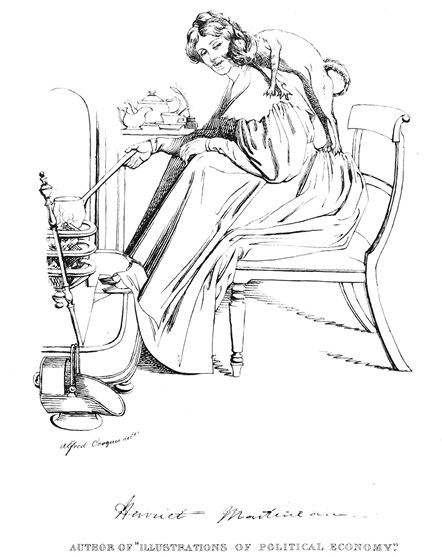 Обсуждаемые в главе 2 «Иллюстрации» Мартино вызвали бы гнев Магинна, независимо от того, был ли их автор мужчиной или женщиной. Как документирует в своем исследовании Fraser’s Magazine Мириам Тралл, с самого начала этот журнал включал «многочисленные статьи и пародии, выражающие его протест против материализма политэкономистов»a. Такой протест занимает самый длинный абзац очерка Магинна с его нападками на Мартино как на «кумира Вестминстерского обозрения» (периодическое издание утилитаристов) и выражением отвращения к тому, чтобы мальтузианские доктрины «повсеместно распространялись, лежали на столах для завтрака молодых и честных и проникали в их умы». Тем не менее я полагаю, что ярость Fraser’s вызывали не только мальтузианские доктрины, журналы и партийная политика утилитаристов. Маклиз рисует Мартино не в домашней обстановке, а в арендованной лондонской квартире, где она кипятит воду для чая и греет ноги у очага. Магинн упоминает «ее чайные принадлежности, ее чернильницу, ее кастрюльку, ее ведерко для углей, ее кресло… все утилитарного вида».