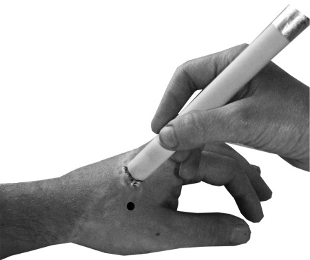 Клюющий способ прижигания – мокса-сигарету быстро поднимают и опускают над кожей, не касаясь ее поверхности.