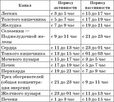 Энергия проходит по каналам последовательно в течение суток, перетекая из одного канала в другой. За 24 часа совершается энергетический кругооборот. Лучше всего воздействовать на определенный канал в период его максимальной активности. Если этот период приходится на время сна, можно использовать для работы время общей концентрации энергии с 21 до 23 часов. Но главное – не проводить терапию в период пассивности канала.