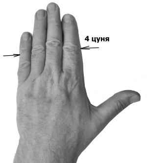 1 цунь – это ширина большого пальца левой руки (у мужчин) по линии, проходящей через угол ногтевого ложа (фото 3). У женщин можно использовать для измерения обе руки.