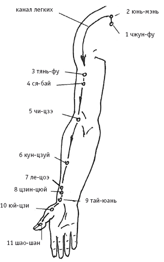 Главные точки канала: возбуждающая точка – 9 тай-юань, успокаивающая точка – 5 чи-цзэ, противоболевая точка – 6 кун-цзуй. Время максимальной активности канала с 03 до 05 часов утра.