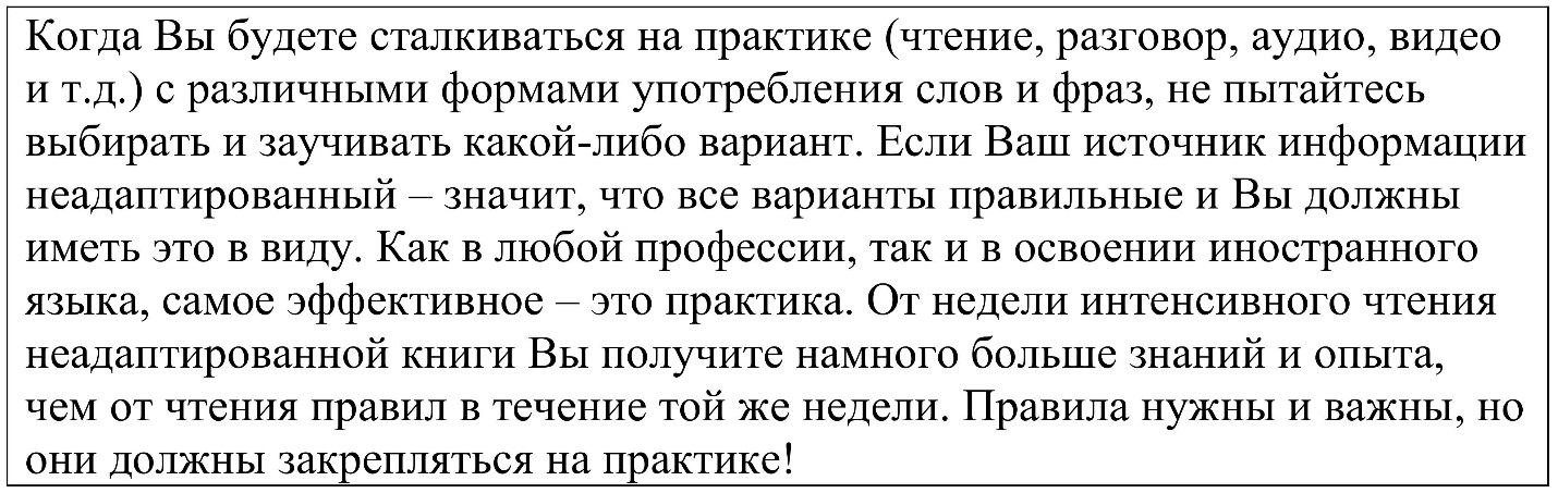 Данную книгу, скорее, можно назвать инструкцией, потому что, как в процессе, так и после ее прочтения, Вы будете постоянно продолжать взаимодействовать с английским. Почему, собственно, предпочтительно употреблять слово «взаимодействовать», а не «изучать»? А потому, что «изучение» подразумевает освоение определенных тем в определенные временные рамки, а «взаимодействие» означает постоянный и даже привычный контакт с английским, который обеспечивает его постоянное совершенствование естественным путем, путем, коим каждый человек осваивает родной язык.