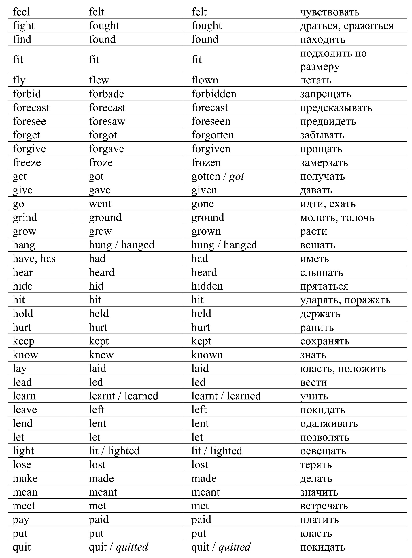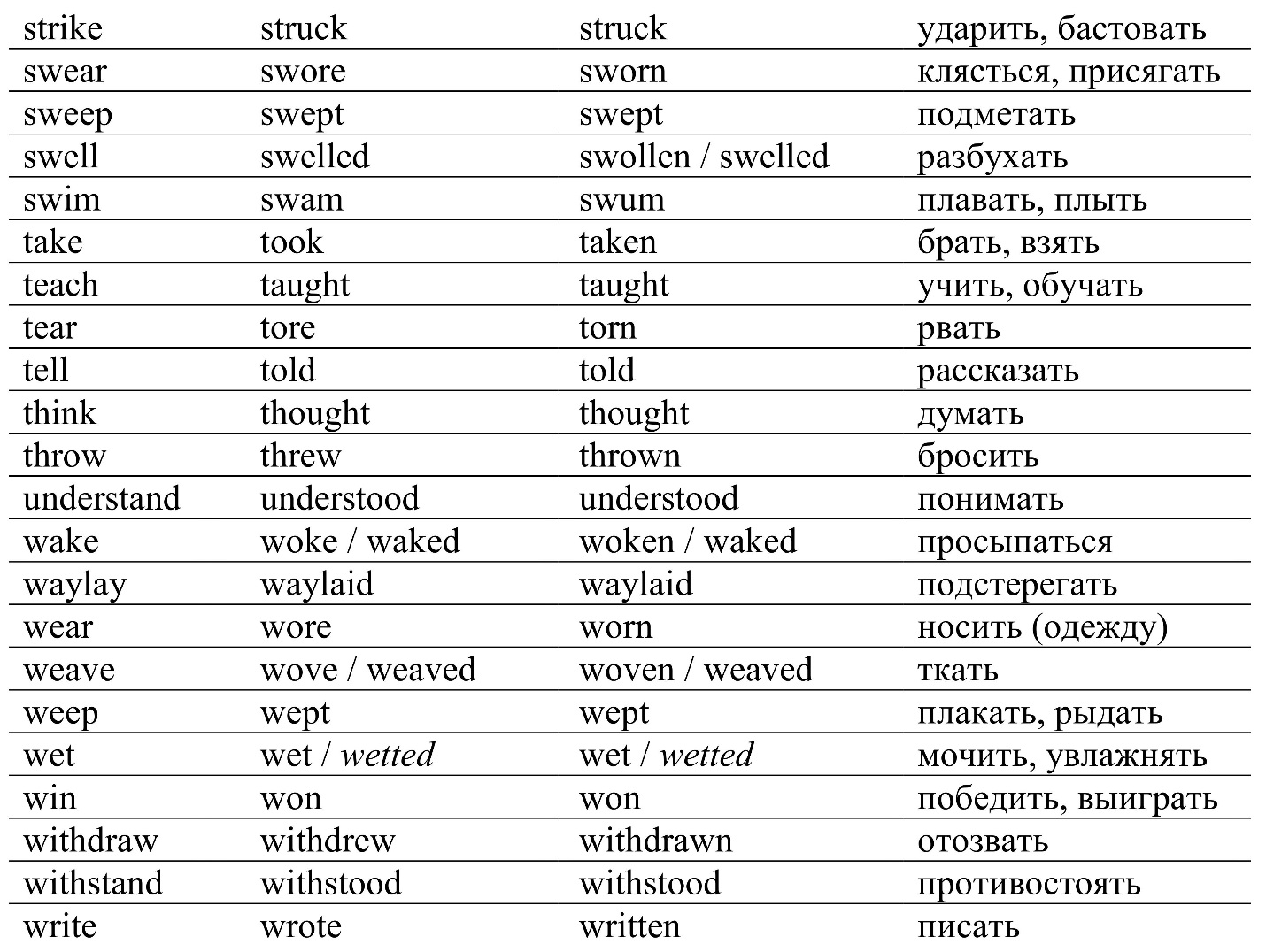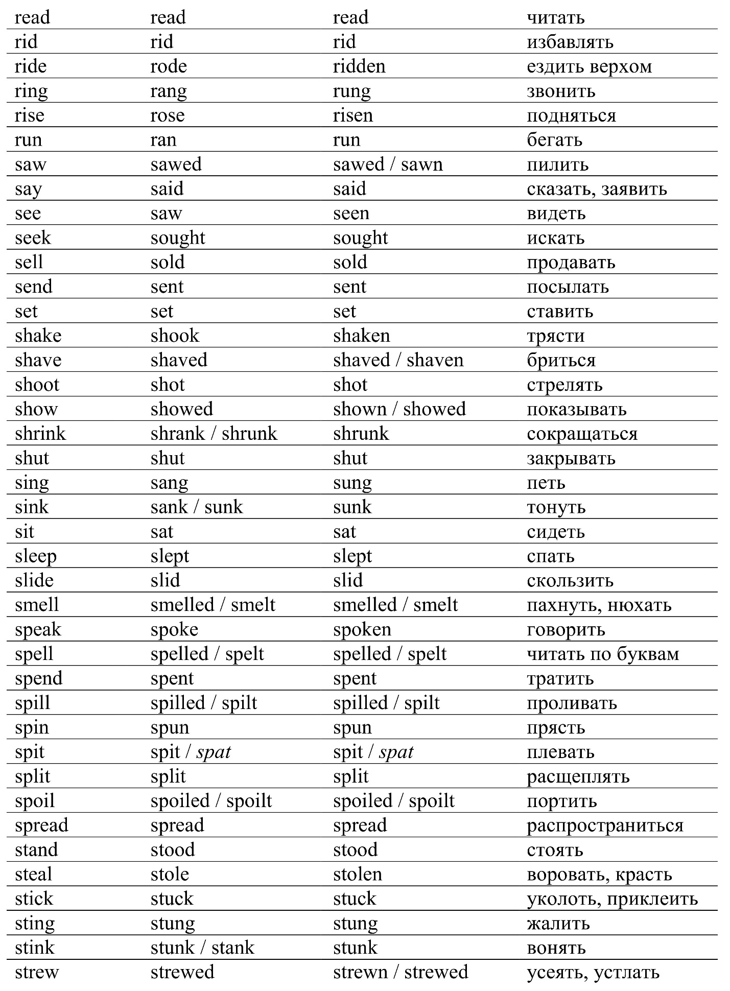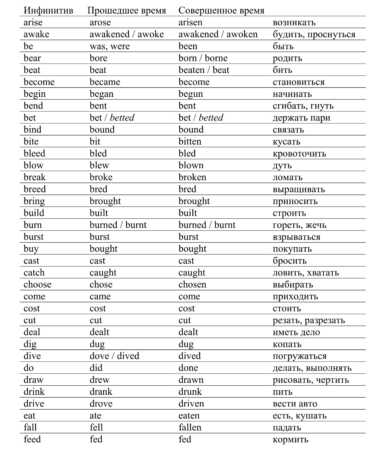 Таблица неправильных глаголов