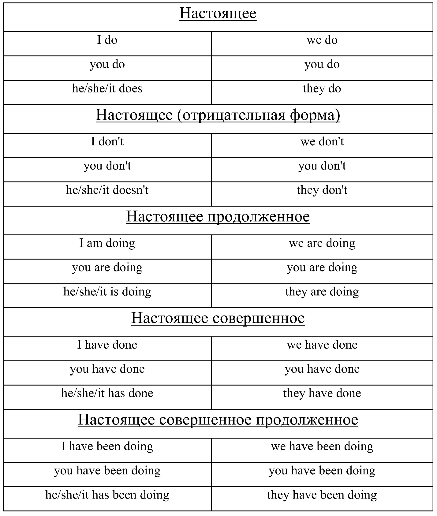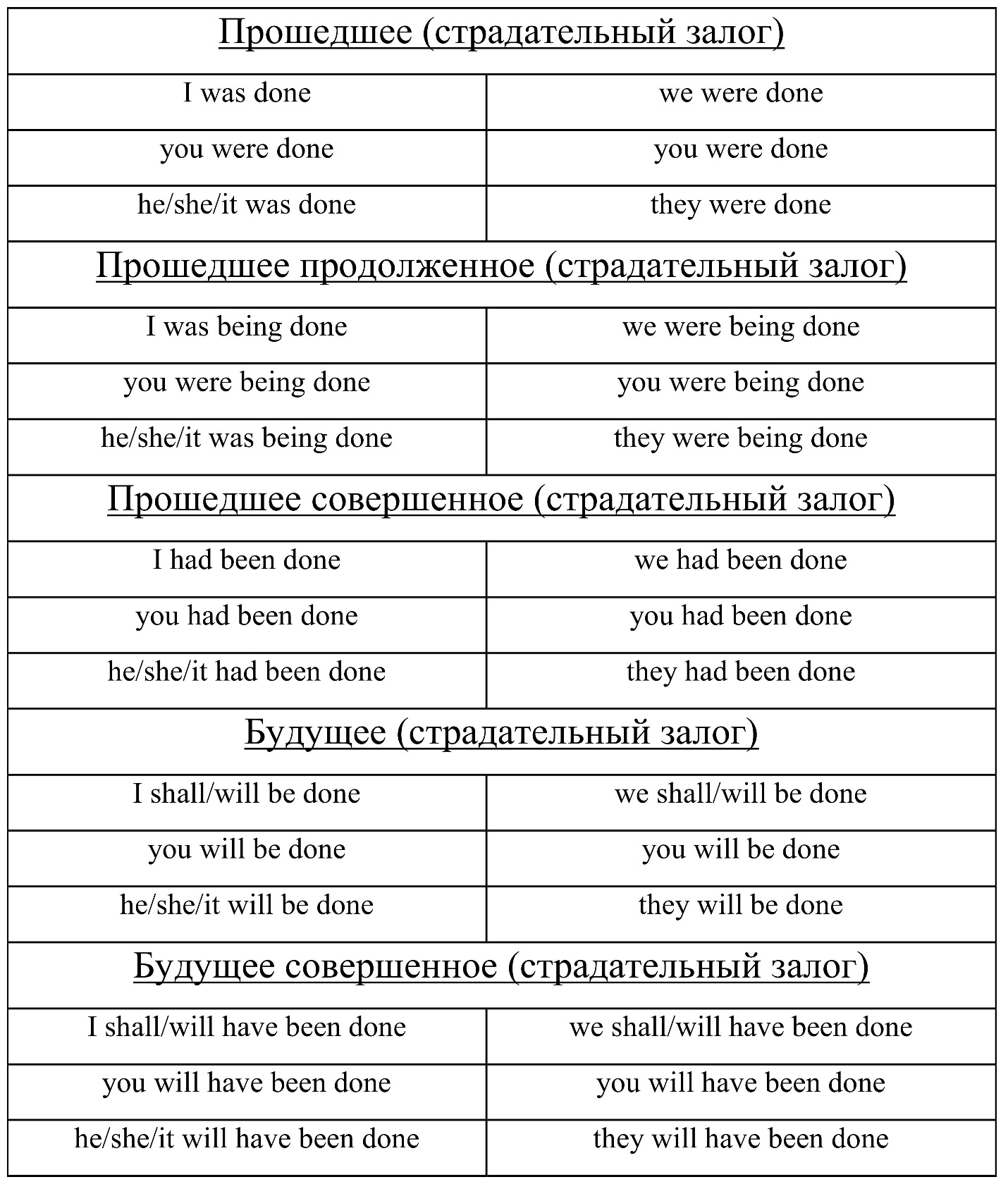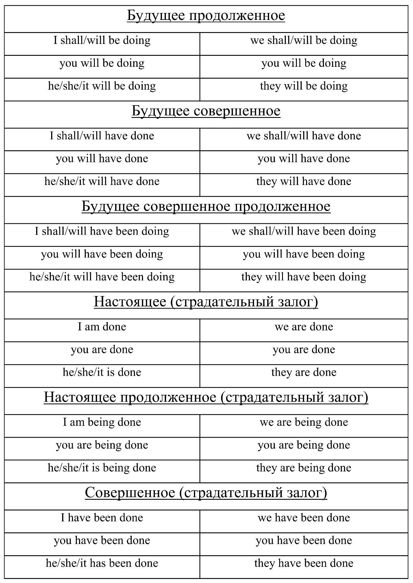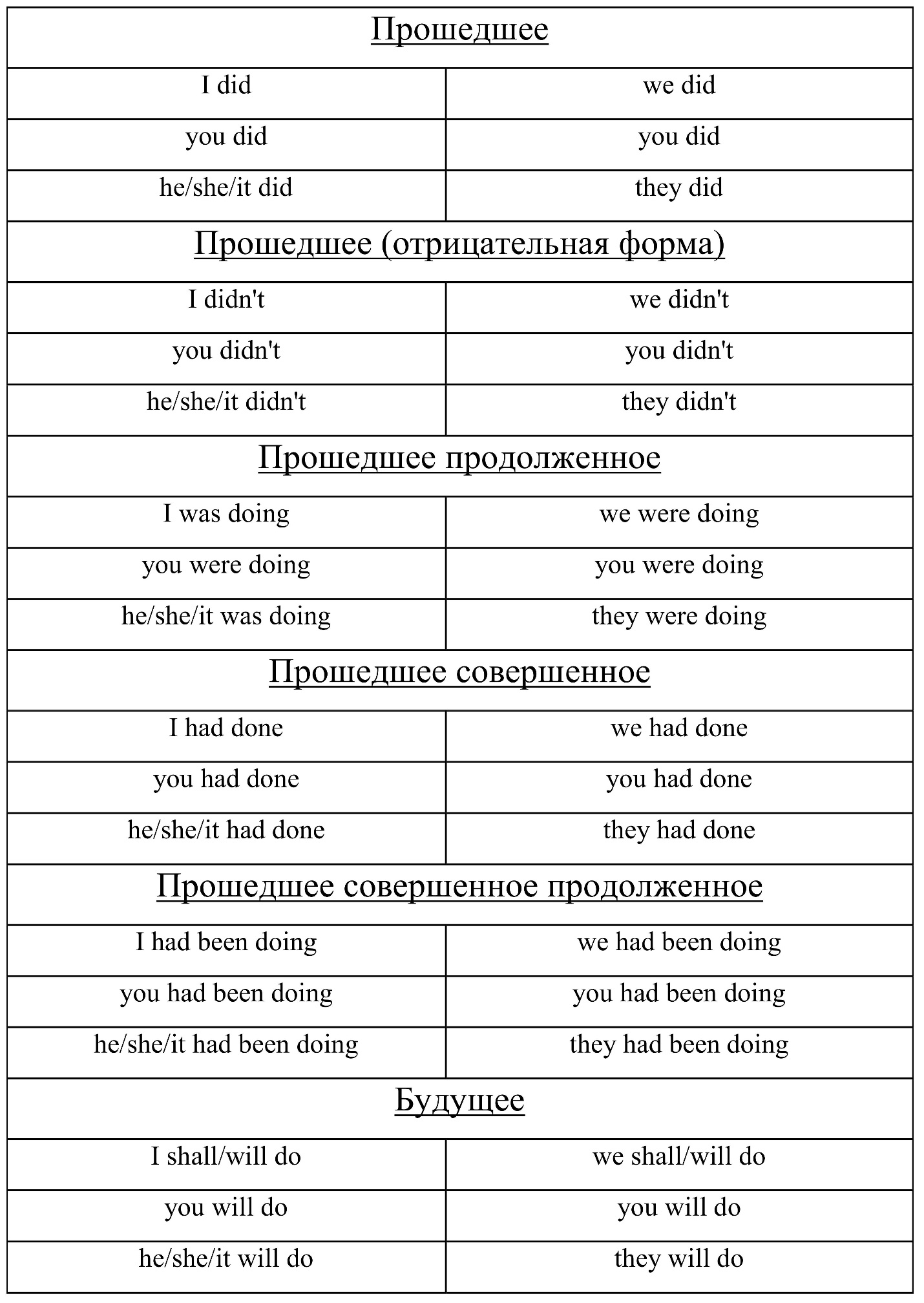 Таблица времен
