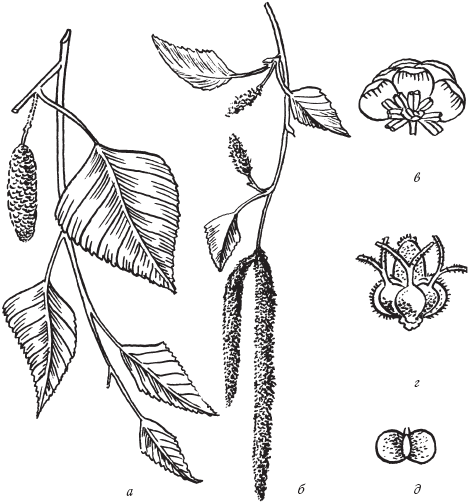 Цветет береза в апреле-мае, когда распускаются листья. Мужские цветки развиваются еще осенью и остаются на зиму, женские появляются во время распускания листьев. Пестичные цветки (рис. 2, в) соединены по 2–3 штуки, имеют трехлопастную чешуйку, прикрывающую 3 двугнездных пестика с 2 нитевидными рыльцами. Тычиночные цветки (рис. 2, г) состоят из раздвоенных тычинок и 1–2 листочков околоцветника.