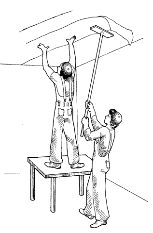 Затем на чистую поверхность кладется каждый точ рисунком вниз и намазывается клеем. После этого следует сложить точ пополам, завернув края, и дать пропитаться клеем в течение 3–5 минут. Теперь концы полотнища нужно разъединить и один его край прижать к потолку, а другой аккуратно уложить на полу. Щеткой или шваброй с чистой тряпкой приглаживается оставшееся полотнище по всей длине, после чего разглаживается по потолку уже наклеенная часть (рис. 1).