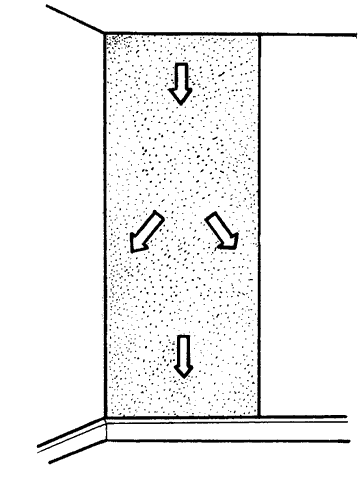 Приклеивать полосу следует начинать с верхнего ее конца, постепенно спускаясь к середине и нижнему краю. Обои растираются чистой тряпкой или щеткой в направлении от середины к боковым кромкам, чтобы удалить из-под них пузырьки воздуха и расправить морщины (рис. 4). Полосы надо располагать строго вертикально, иначе рисунок может не совпасть. Обои приклеиваются так, чтобы швы шли против света, это сделает их менее заметными.