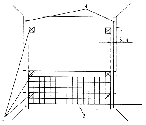 Рис. 8. Облицовка стен плиткой по маякам: 1 – гвозди; 2 – шнур отвеса; 3 – маячные плитки; 4 – причальный шнур