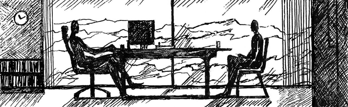 Наконец впереди показалась цель его пути. Л ожидал увидеть целое скопление офисов и цехов, однако перед ним высилось только одно здание в шесть этажей. Его металлические стены, чередующиеся со стеклами панорамных окон, вырезали офис темным силуэтом на фоне голубого неба и испещренных бороздами склонов ущелья.