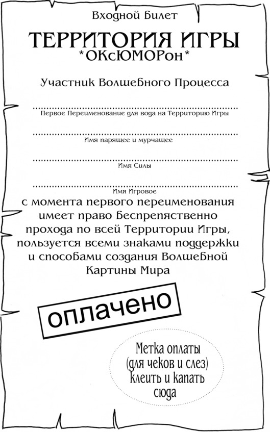 У вас есть ВХОДНОЙ БИЛЕТ НА ТЕРРИТОРИЮ ИГРЫ, а книга представляет собой «Руководство», которое поможет вам ориентироваться в этом Пространстве. В любой игре существуют свои правила. В «Руководстве» изложены те, что необходимы вам для начала игры. Правила будут добавляться по мере изложения, и вы научитесь самостоятельно дополнять существующие правила и создавать новые.