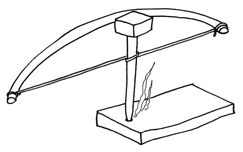 При трении утяжелитель надавливает на конец стержня, и стрежень вращается при помощи лука. Чтобы не сломать стержень, надо брать менее плотный и твёрдый утяжелитель.