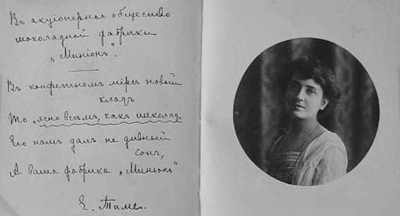 Когда грущу или скучаю,Иль озабочен, утомлен,То бремя жизни облегчаюВсегда конфектами «Миньон».Балерина Агриппина Ваганова: «Кушать Ваши шоколадные конфекты так же приятно, как танцевать с оркестром под управлением господина Дриго». Певица Лидия Липковская: «Конфекты фабрики „Миньон” обьядение!!! Сладкоежка Липковская».