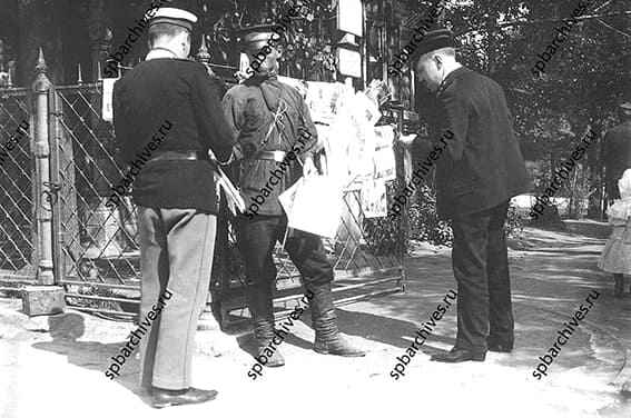 Продажа газетчиками у Александровского сада «Петербургского листка» с манифестом об учреждении Думы. Дата съемки: 19 августа 1905 г. Место съемки: Санкт-Петербург. Фотография ателье Буллы