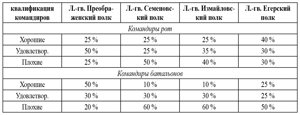 Однако наблюдения над офицерским составом лейб-гвардии Измайловского полка, сделанные в Первую мировую войну, не позволяют безоговорочно принять тезис об особой его инициативности. По высказанной в 1929 г. оценке измайловца же, полковника А.Я. фон Бретцеля 1-го, в 1914–1915 гг. в полку было «несколько случаев блестящих операций, по инициативе командиров рот», но для 1914-го Бретцель припомнил лишь один такой случай (для 1915-го – три). По той же оценке, выдающимися и хорошими в кампании 1914 г. в полку выказали себя только 2 из 4 командиров батальонов и лишь 6 из 16 командиров рот57. Для офицерского состава, особо склонного к проявлению инициативы, этого слишком мало (тем паче, что остальные 2 «батальонера» и 10 ротных оказались вообще неудовлетворительными58).
