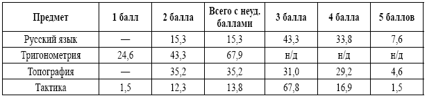 Оценки, полученные на приемных экзаменах командирами, принятыми в 1933 г. на командный факультет Военной академии механизации и моторизации РККА (в %)135