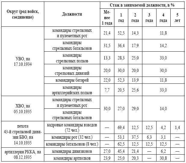 Стаж в занимаемой должности комсостава некоторых соединений, округов и родов войск в 1934–1935 гг.164