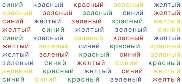 Необходимо быстро называть цвет, которым напечатаны все слова, за одну минуту, чем больше слов (по цвету) вы успеете назвать, тем лучше. Если вам не удалось правильно назвать все цвета – риск развития мозговых нарушений очень велик. Продолжайте тренировки регулярно, это будет способствовать улучшению работы мозга.