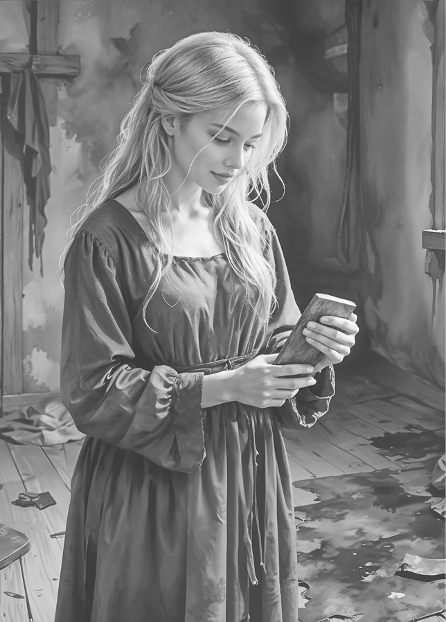 Помимо хозяина жилища, в нем присутствовало существо, скорчившееся в углу над какой-то тряпкой с костяной иглой в руке. На голове мятый чепец, тело прикрывает драное, грязное платье. Похоже, женщина, но это не точно, так как при виде меня существо съежилось и спрятало лицо в большие ладони, изуродованные артритом.