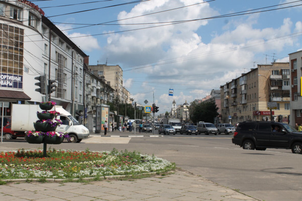 Раньше по Советской ходил трамвай. Площадь с названием Тверская находится в самом центре города, там виден купол тверского цирка и фонтан в сквере. Вот мы туда и пойдем, нам только Старый мост перейти и снова пройти мимо Путевого дворца и мимо медицинской академии.