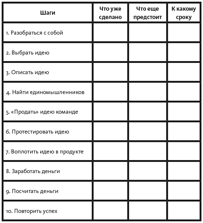 Ровно так построена книга. Сначала мы будем разбираться с собой, потом с клиентами, затем с продуктом и в финале с финансовой стороной бизнеса. А пока посмотри еще раз на 10 шагов от идеи к своему бизнесу: на каком из них сейчас ты?