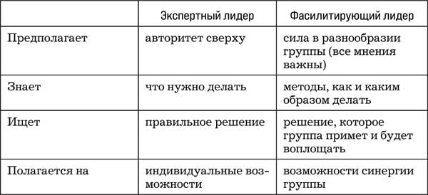 Фасилитирующий же или вовлекающий лидер изначально предполагает, что сила в разнообразии как самой группы, так и информации. Он знает и практикует методы, которые помогают ему вместе с командой найти лучшее решение, то, которое они вместе и будут реализовывать. Также он опирается на возможности самой группы – верит, что ценны не только звездные специалисты, но большой потенциал заложен в самой команде, в синергии всех этих талантливых людей, которые собрались под его началом.