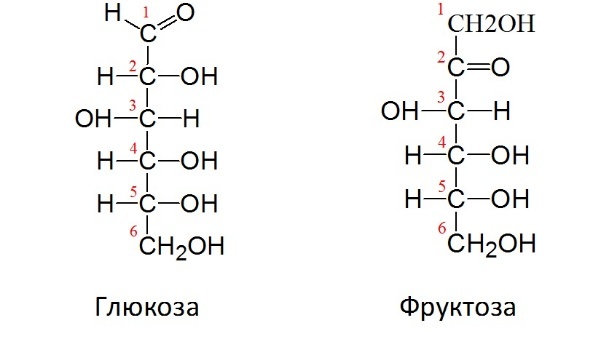 Моносахариды, в структуре которых находится альдегидная группа (Н-С=О), называют альдозами, моносахариды, включающие кето-группу (С=О), называют кетозами. Примером таких моносахаридов являются глюкоза (альдоза) и фруктоза (кетоза):