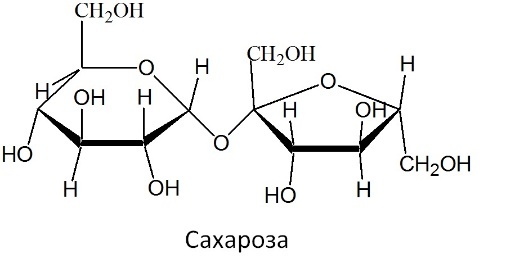 Моносахариды в молекуле сложных углеводов соединяются между собой гликозидной связью. Гликозидная или О-гликозидная связь образуется в результате реакции дегидратации (удаления Н2О) между двумя ОН-группами двух моносахаридов. Например, дисахарид-сахароза состоит из D-глюкозы и D-фруктозы.