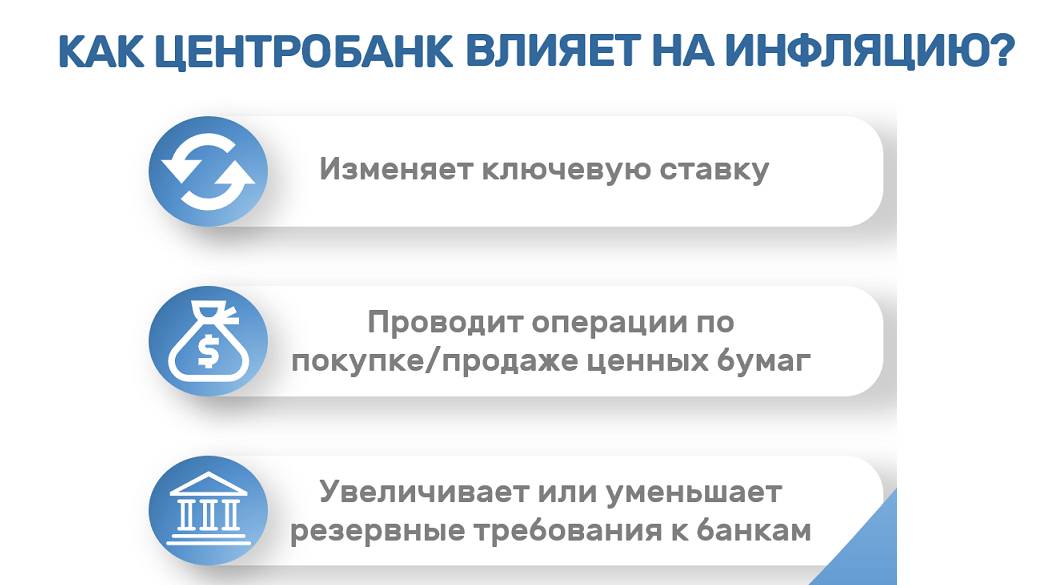 Центральный банк регулирует темпы инфляции, изменяя ключевую ставку. Ключевой ставкой называется минимальный процент, под который ЦБ занимает деньги коммерческим банкам.