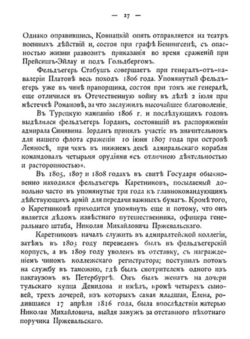 «Кроме того, о Каретникове приходится упомянуть еще и потому, что он является дедом известного путешественника, офицера генерального штаба Николая Михайловича Пржевальского».