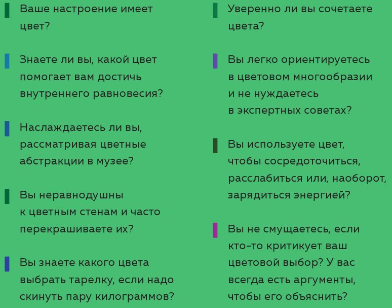 Чтобы освоить этот инструмент, не требуется специального художественного образования или диплома дизайнера. Каждый человек обладает цветовой интуицией с рождения. Мы справляемся с оформлением презентации на работе, подбором сумочки к пальто или галстука к рубашке. Правда за бессознательным выбором оттенков скрываются накопленные представления о «правильных» цветах: мы хорошо помним бабушкино презрение к «разнузданной богеме» и ее убеждение, что «бледность – признак аристократичности». А когда наступает ответственный момент сознательного выбора цвета, мы теряемся.