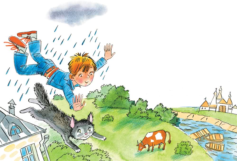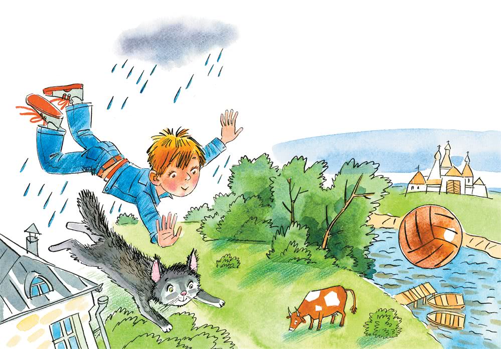 Мы с Кузей быстро поднялись в воздух, а мяч летел перед нами. Вниз я не смотрел. Боялся – голова закружится. Чтобы не было очень страшно, я не сводил глаз с мяча. Долго ли мы летели – не знаю. Не хочу врать. В небе светило солнце, а мы с Кузей неслись за мячом, как будто были привязаны к нему верёвочкой и он тащил нас на буксире.