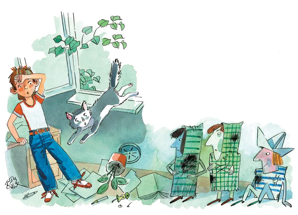 Раздался такой грохот, словно с высокого дома на мостовую упали сорок тысяч железных бочек. Кузя метнулся с подоконника и прижался к моим ногам. Стало темно, как будто потухло солнце. А ведь оно только что светило. Потом комната озарилась зеленоватым светом, и я заметил каких-то странных человечков. На них были балахоны из покрытой кляксами мятой бумаги. У одного на груди чернело очень знакомое пятно с ручками, ножками и рожками. Точно такие же ножки-ручки я пририсовывал кляксе, которую посадил на обложку учебника географии.