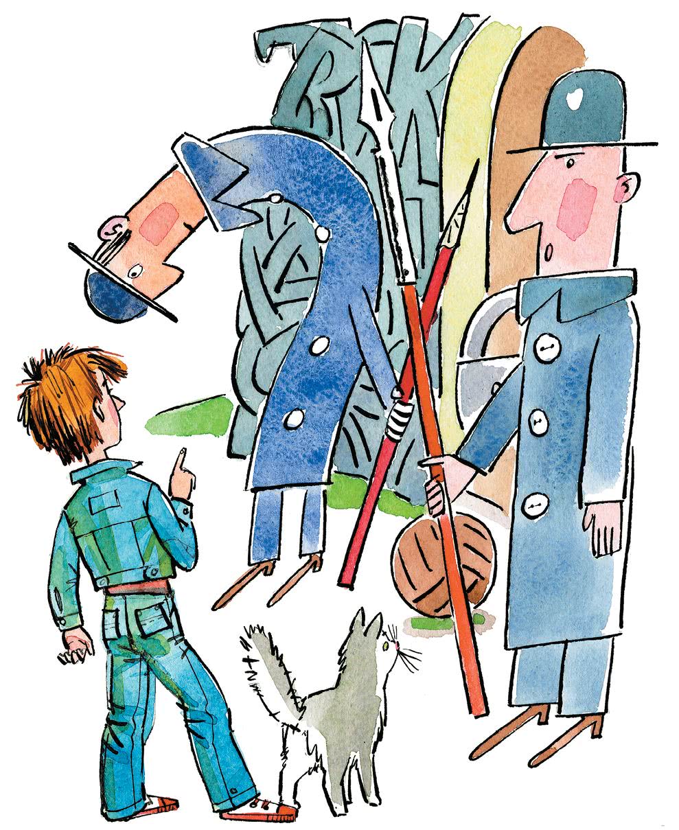 Согнутый держал огромную ручку, а прямой – такой же карандаш. Они стояли неподвижно, словно неживые. Я подошёл поближе и потрогал согнутого пальцем. Он не пошевелился. Кузя обнюхал их обоих и заявил, что, по его мнению, они всё-таки живые, хотя человеком от них не пахнет. Мы с Кузей назвали их Крючок и Палка. Наш мяч рвался в ворота. Я подошёл к ним и хотел попробовать толкнуть замóк. А вдруг он не заперт? Крючок и Палка скрестили ручку и карандаш и преградили мне дорогу.