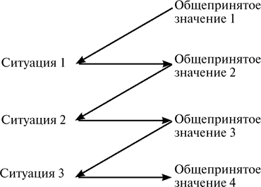 На этом месте история Zernatto заканчивается, а мы можем остановиться, чтобы вглядеться в нее попристальней. В некотором отношении история слова «нация» позволяет предвосхитить схему анализа, по большей части используемую в данной книге. Последовательные изменения в значении складываются в модель, которую можно, из формальных соображений, назвать «зигзагообразной моделью семантического изменения». На каждой стадии своего развития значение слова, которое приходит с определенным семантическим багажом, возникает из использования слова в конкретной ситуации. Уже имеющееся общепринятое понятие применяется в новых обстоятельствах к тем аспектам ситуации, с которыми это понятие соотносится. Однако отсутствовавшие ранее аспекты новой ситуации начинают с этим понятием ассоциироваться; в результате возникает двойственность значения понятия. Изначальное значение постепенно уходит в тень, и общепринятым становится новое значение. Когда слово опять используется в новой ситуации, оно, скорее всего, используется в этом новом значении, и так далее. (Эта модель показана на рис. 1).