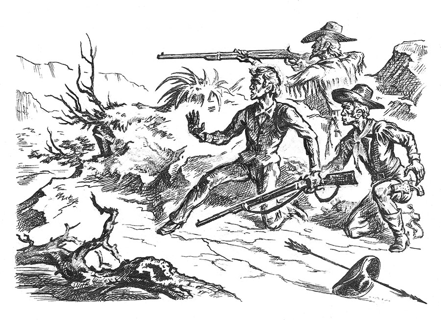 Но едва Джо перешагнул через преданного спутника, как вздрогнул, замер, левой рукой задержал Генри у себя за спиной, а правой выхватил револьвер.