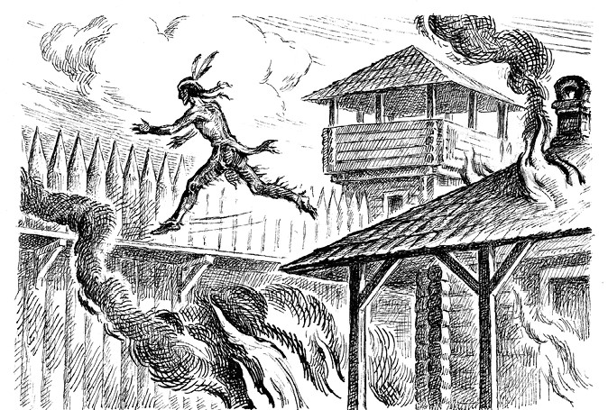 Старый блокгауз горел. Над ним извивались желто-алые языки пламени, валил черный дым, скрывая ясное небо. Летели искры. Бочонки с порохом давно взорвались. В огне один за другим гремели «залпы» с каждым новым загоревшимся ящичком патронов. Северный ветер еще выше вздымал пламя. Огонь с наслаждением поглощал старое просмоленное дерево. Вот уже пламя перекинулось на комендатуру и сторожевую башню.