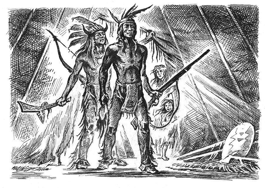 Вождь вошел в шатер вместе с Маттотаупой. У каждого было по два трофейных скальпа – длинные черные волосы с лоскутом кожи с макушки. Они передали эти знаки победы женщине. Скальпы надо было высушить, дух павших воинов женщины должны были заклясть в танце. Сам вид вождя и Маттотаупы свидетельствовал о жестокой схватке: по их запыленным телам струился пот, кое-где запеклась кровь; одежда была в грязи и разорвана, волосы спутаны, щеки и глаза запали. Вероятнее всего, они думали не о славе, которую принесла им оборона от неприятеля и добытые скальпы, а о том, чтобы помыться в ручье и поспать. Они ни о чем не спрашивали, и вождь не отдал никаких распоряжений, окинув внутренность шатра взглядом. Потребовал только горшочек с жиром и, получив его от дочери, вышел из шатра вместе с Маттотаупой.