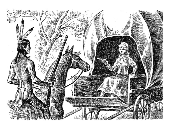 В тот же миг всадник-индеец с быстротой молнии увернулся, и пуля пролетела мимо него. Осадив коня возле двух головных мулов, он схватился за волочащиеся по земле поводья. Мулы и фургон тотчас же остановились. Кейт по-прежнему сжимала в руке пистолет. Индеец повернул коня, остановился и сверху вниз устремил взгляд на девушку. Кейт не решилась выстрелить во второй раз. На мгновение она встретилась с ним взглядом: ей показалось, что глаза его почти закрыты, и она уронила руку, сжимающую пистолет.
