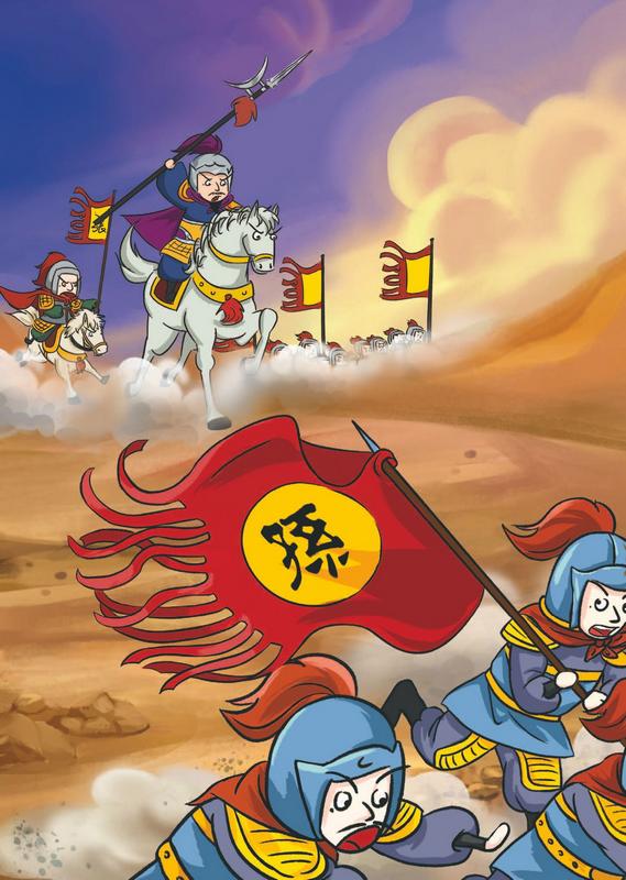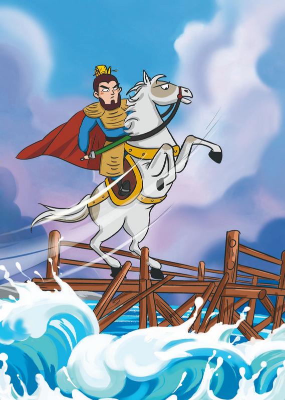 Сунь Цюань вспомнил про Лю Бэя, как тот оказался на краю гибели и как ему чудом удалось преодолеть бурный Сандаловый ручей Таньси. «А я что же, ни на что не годен?!» – подумал он и, пришпорив коня, помчался по мосту на другую сторону. Он натянул поводья, и его конь будто взлетел! Сунь Цюань зажмурился от страха. Через несколько секунд он очнулся, когда копыта коня ударились обо что-то твердое. «Ура! Мне удалось! Я смог!» – ликовал Сунь Цюань.