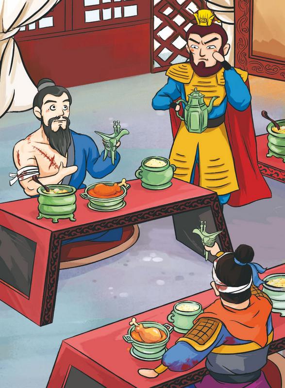 Сунь Цюань налил ему полную чашу вина, которую Чжоу Тай залпом выпил. Потом Сунь Цюань стал расспрашивать его о ранениях в живот. Тот рассказал:
