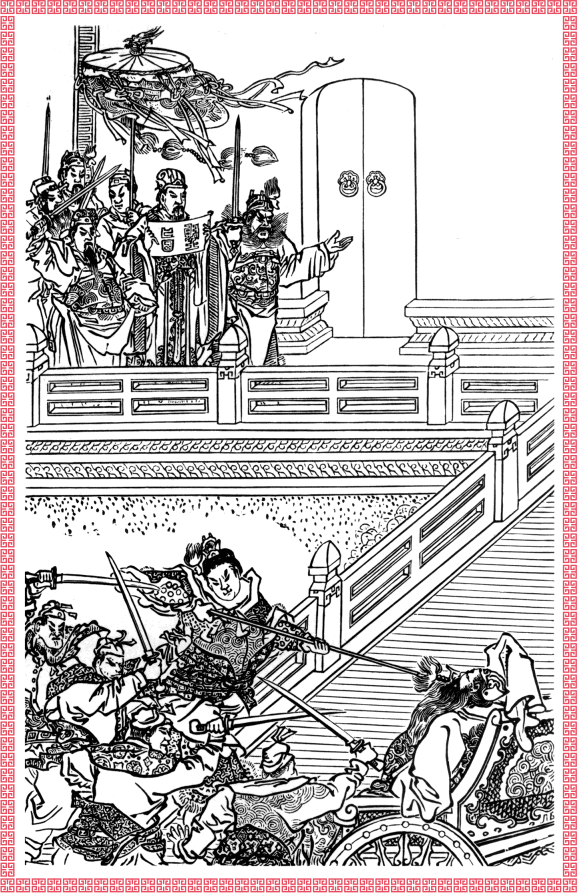 – Есть повеление покарать мятежника! – крикнул в ответ Люй Бу и алебардой пронзил ему горло.