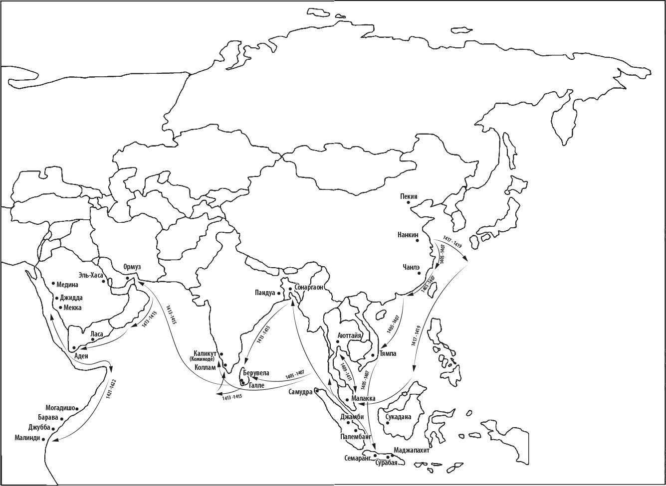 Рис. 1. Маршруты всех плаваний флотилии Чжэн Хэ