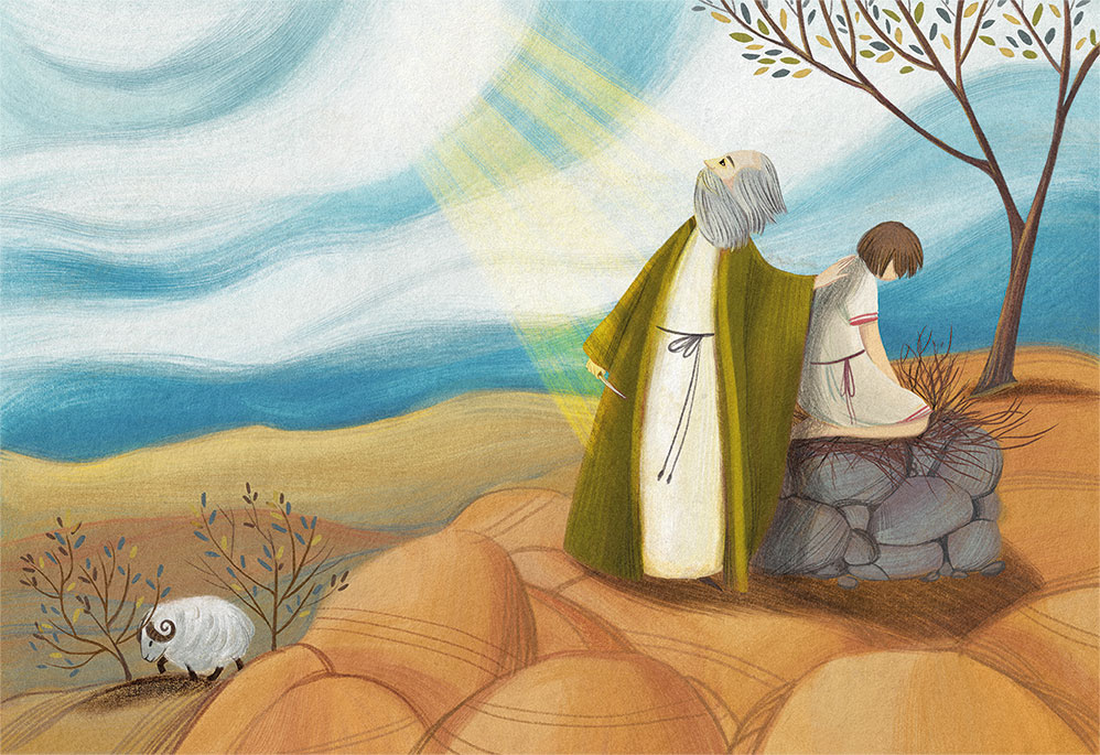 Добравшись до вершины, они собрали алтарь из камней и развели огонь. Исаак знал, что для жертвоприношения Богу нужен алтарь, а дрова нужны, чтобы разжечь огонь, но чего-то не хватало; он спросил у отца: «А где же ягнёнок для жертвоприношения?». Авраам не ответил и с преисполненным горя сердцем схватил Исаака, чтобы привязать его к дровам. В это мгновение раздался голос Господень: