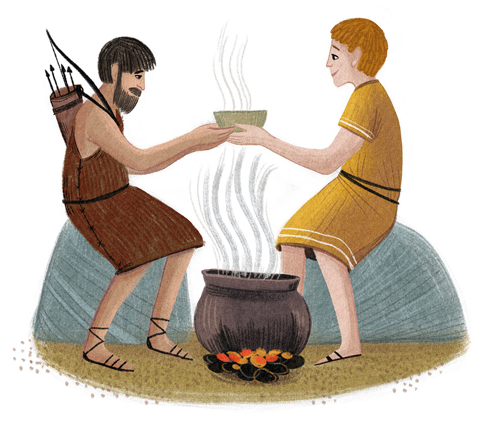 Однажды Исав вернулся с охоты очень усталым и увидел, что его брат Иаков только-только приготовил прекрасный чечевичный суп; он подошёл и спросил: «Можно мне немного, пожалуйста? Умираю от голода».