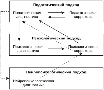 Основываясь на имеющихся в психолого–педагогической литературе данных, можно говорить о том, что в настоящее время в практике школьного обучения сложилось несколько подходов к диагностике и коррекции причин, вызывающих те или иные трудности в школьном обучении: педагогический (самый ранний) и более поздние – психологический и нейропсихологический (рис. 1).